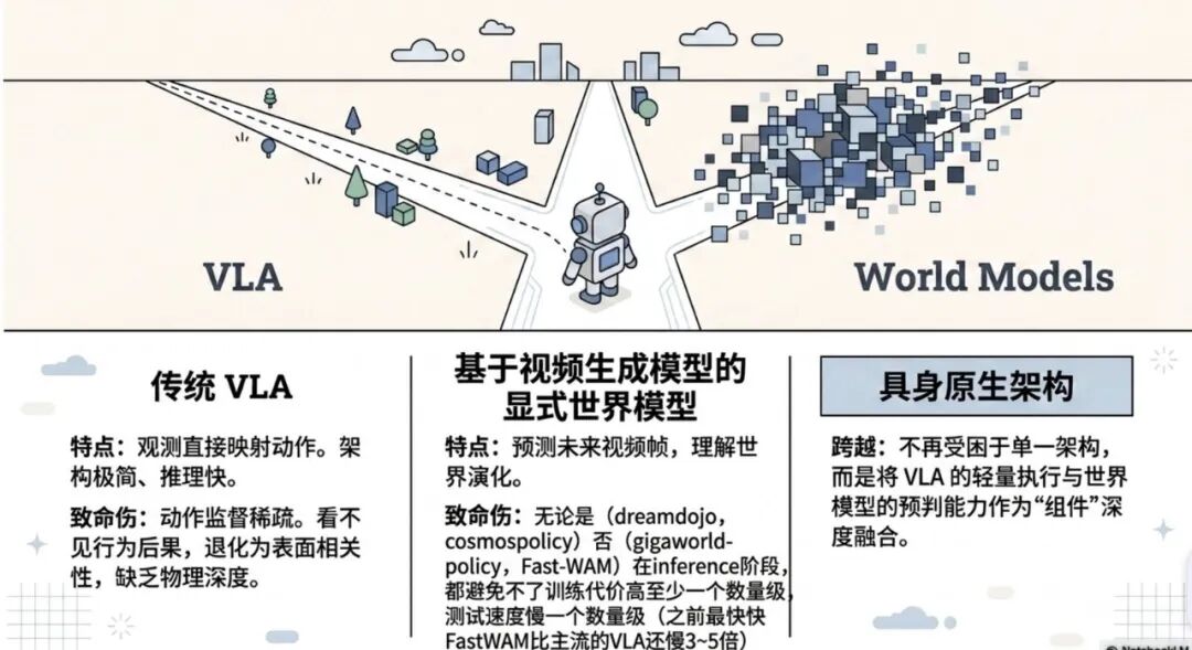 另一支是 WAM(World-Action Models),试图通过预测未来的视频帧来引入对世界演化的理解。这条路理论上很完整,但工程上代价巨大。