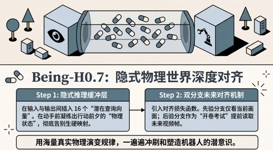 Being-H0.7 在数据量推到 20 万小时后,把对齐目标从动作空间转移到了隐空间,让模型通过训练路径把人类视频里的物理规律吸收进策略,不再需要把人类视频转换成机器人动作标签。