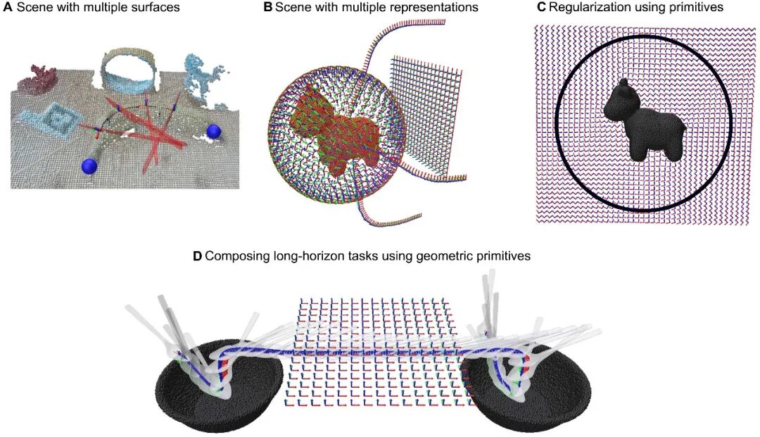 在强化学习中,它的优势更为突出。智能体可以在这个被大大简化了的、与具体形状无关的局部动作空间中进行学习,学习效率得到指数级提升。实验证明,一个在简单二维圆形上学习到的“到达-跟随”策略,竟然可以直接“零样本”迁移(zero-shot transfer)到一个复杂的、随机生成的3D点云物体上并成功执行任务,而无需任何重新训练。这在过去是难以想象的。